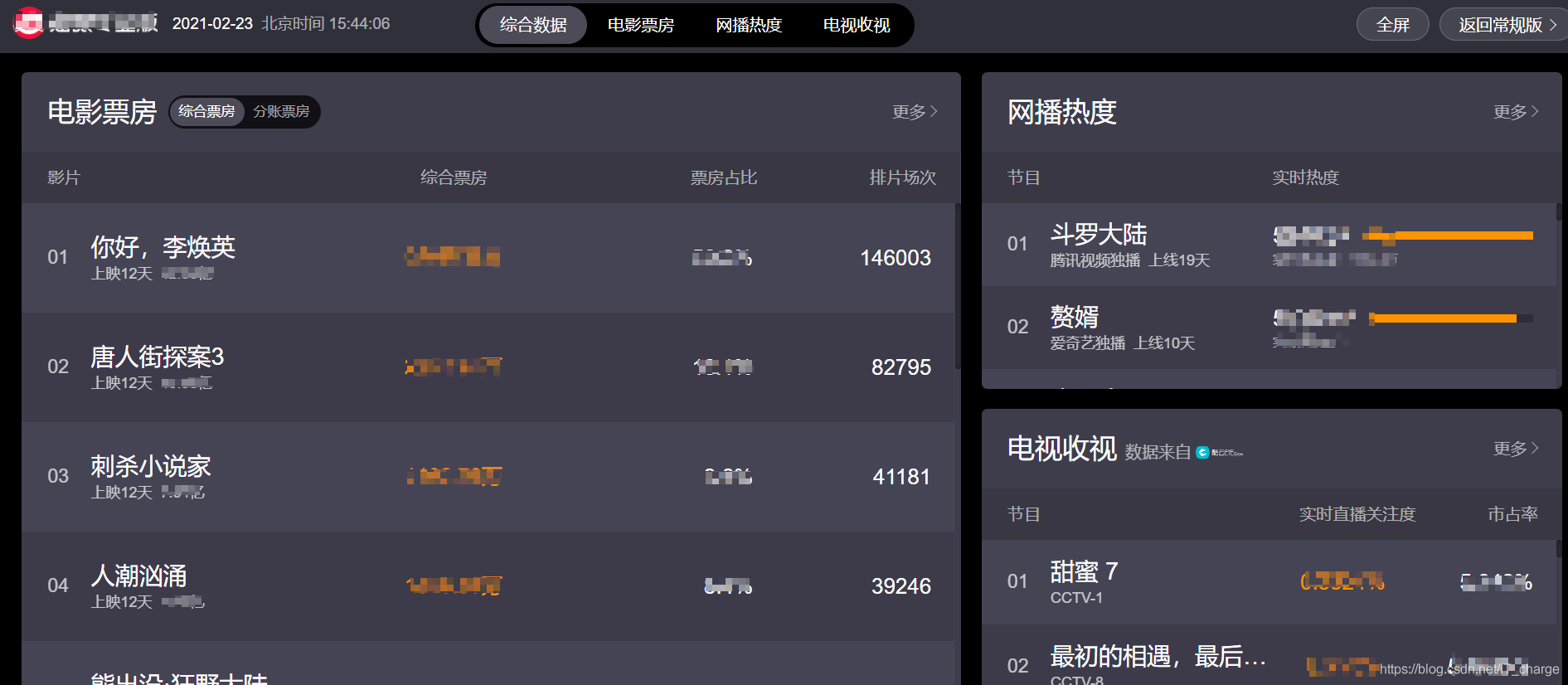 # 上映信息(上映天數(shù)), 排片場次, 排片占比, 綜合票房,累積總票房
