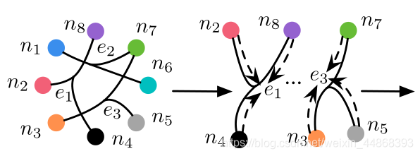 對于超圖,其與圖結(jié)構(gòu)最主要的區(qū)別就是一條邊可以連接多個節(jié)點,因此我們可以認為圖是一種特殊的超圖。超圖結(jié)構(gòu)如下圖所示。