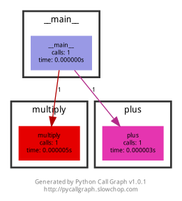 這個案例的功能,僅僅是把加法和乘法進行了函數的封裝,再在main函數中調用,執(zhí)行結果和pycallgraph生成的圖片如下圖所示: