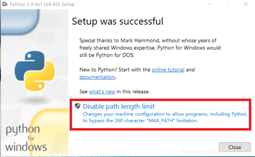 點(diǎn)擊下面的Disable path length limit,意思是解除路徑的長(zhǎng)度限制,點(diǎn)了以后點(diǎn)Close結(jié)束安裝程序