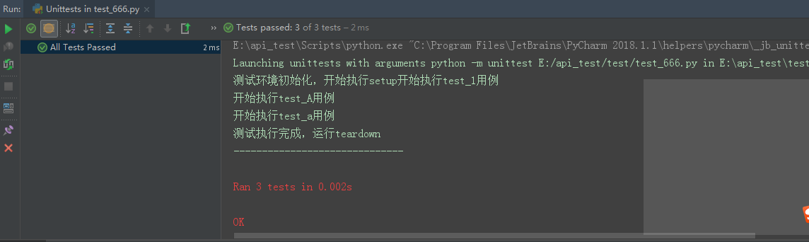 可以看到所有用例都執(zhí)行完后,setUpClass()和tearDownClass()只運(yùn)行了一次。因此在編寫一個(gè)測(cè)試腳本時(shí),里面寫了多個(gè)測(cè)試用例,