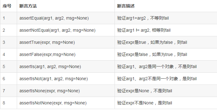 無(wú)論是什么樣的測(cè)試用例,最后都需要有用例執(zhí)行后的驗(yàn)證,在接口自動(dòng)化測(cè)試中我們執(zhí)行完接口用例也需要驗(yàn)證斷言用例執(zhí)行是否滿足我們的預(yù)期。unittest提供了豐富的斷言方法,常見(jiàn)的斷言如下表: