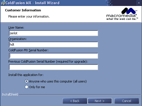第二步,在下面出現(xiàn)的窗口中填入用戶名,密碼,ColdFusion MX的序列號,不同的序列號決定ColdFusion MX的版本。ColdFusion MX共分為4種版本,開發(fā)者版本(不需要填入序列號),專業(yè)版,企業(yè)版,J2EE嵌入版。如果需要從老版本升級,那么填入升級所需的序列號。然后再選擇能夠操作該軟件的用戶。