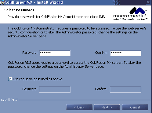 第六步,填入ColdFusion MX管理的密碼,這里的密碼一定要記好,另外,可以讓ColdFusion RDS的密碼和administrator的密碼一致,也可以另行輸入。RDS就是遠(yuǎn)程數(shù)據(jù)管理的意思,以后的數(shù)據(jù)庫等在ColdFusion Studio或者DreamweaverMX中的操作就通過RDS。