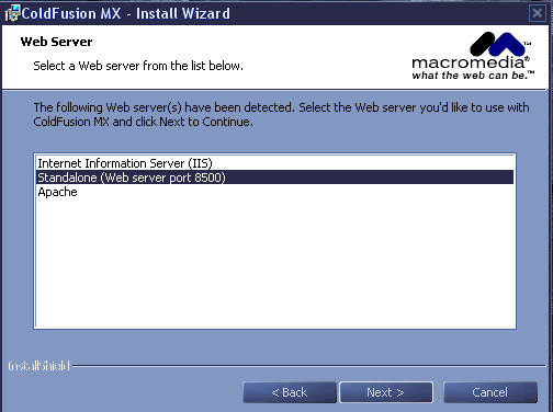 第三步,選擇ColdFusion MX所在的Web服務(wù)器,可以是IIS,Apache,也可以是Standalone模式,也就是讓ColdFusion MX自己作為Web服務(wù)器。下圖選擇了Standalone模式,端口是8500。