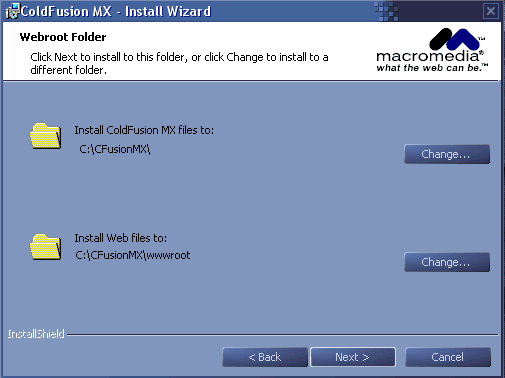 第四步,選擇ColdFusion MX文件存放的位置和Web頁面所存放的位置,這一步的情況與上一步選擇webServer相關(guān)。