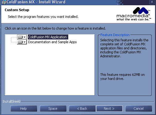 第五步,進(jìn)行以下安裝到硬盤內(nèi)容的選擇,但運(yùn)行ColdFusion MX環(huán)境的文件是必須安裝的。