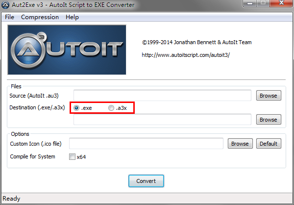 可以看到AutoIt允許用戶將au3的明文腳本編譯成exe文件或者a3x文件。exe文件自不必贅述,就是我們平時(shí)熟悉的PE文件,但如果編譯成exe文件,則失去了AutoIt腳本在惡意程序領(lǐng)域的優(yōu)勢(shì)(懂的自然懂,不細(xì)說(shuō)),所以目前捕獲的大多數(shù)惡意樣本都是將腳本編譯成a3x文件。