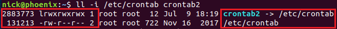 還拿 /etc/crontab 文件舉例子,這次創(chuàng)建一個軟鏈接并查看其文件屬性: