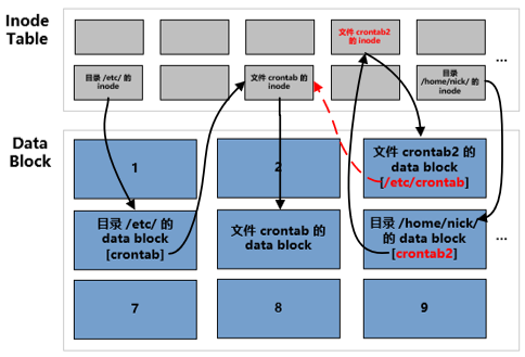 從上圖我們可以看出,軟鏈接文件 crontab2 是一個實實在在的文件,有自己的 inode 和 data block。但是它的 data block 中保存的是目標文件的地址:/etc/crontab。 像 open() 這樣的 API 能夠識別出軟鏈接,并根據(jù) data block 中的目標文件徑把操作重定向到目標文件上。