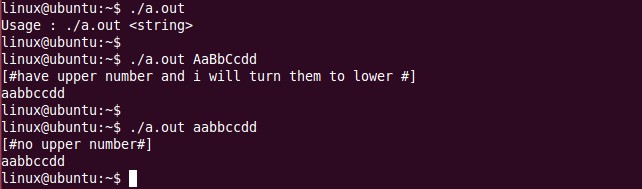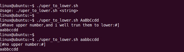 功能說明:當(dāng)輸入”./upper_to_lower.sh AaBbCcdd“時會先判斷輸入格式是否正確,然后判斷字符串中是否有大寫字母如果有顯示"[#have upper number,and i well trun them to lower:#]"和轉(zhuǎn)換成小寫字母后的字符串;如果沒有大寫字母顯示"[#no upper number:#]"和小寫字符串。