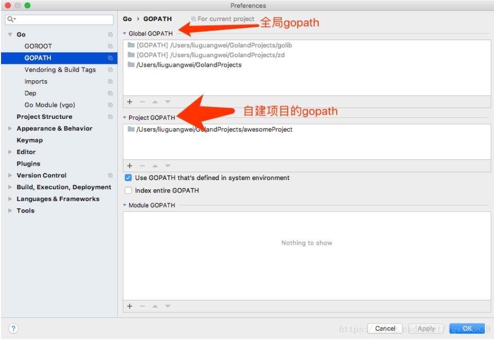 其中index entire GOPATH我一般去掉勾選,因?yàn)槲伊?xí)慣每個(gè)項(xiàng)目單獨(dú)一個(gè)環(huán)境,不與其他項(xiàng)目公用