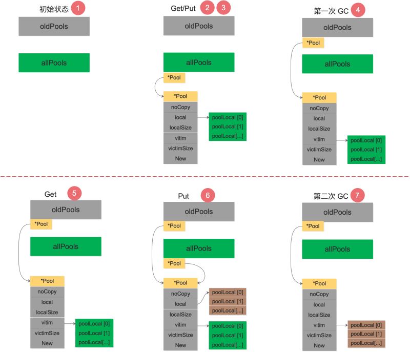 需要指出的是,allPools 和 oldPools 都是切片,切片的元素是指向 Pool 的指針,Get/Put 操作不需要通過它們。在第 6 步,如果還有其他 Pool 執(zhí)行了 Put 操作,allPools 這時(shí)就會有多個(gè)元素。