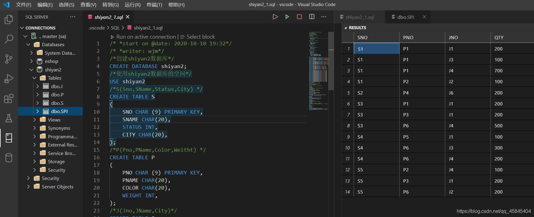 接下來我們在shiyan2數(shù)據(jù)庫中創(chuàng)建S,J,SPJ表,并插入數(shù)據(jù)。