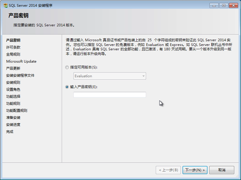 4、單擊“全新 SQL Server 獨(dú)立安裝或向現(xiàn)有安裝添加功能”選項(xiàng),彈出“產(chǎn)品密鑰”對(duì)話框。