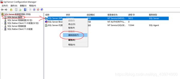 注意:這里需要重啟 SQL Server 剛剛的設(shè)置才會(huì)生效(這影響到后面介紹的用 sa 用戶名是否能正常登錄) 打開剛剛的【SQL Server 2017 配置管理器】,如下圖重啟SQL Server,然后再重新打開SSMS登錄后進(jìn)行后面的操作