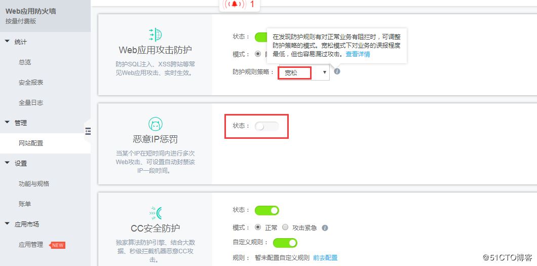 從上圖可以看出,“Web應用防護”策略是寬松模式,其主要作用就是防護SQL注入、XSS跨站等常見Web應用,寬松模式下對業(yè)務的誤報程度最低,但也容易漏過***?!皭阂釯P懲罰”也沒啟用。這么寬松的防護措施風險比較大。趕緊先調整吧。
