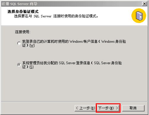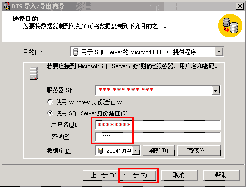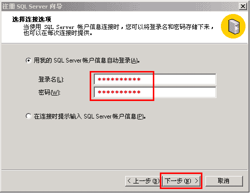 7、按下圖所示,按您的訂單中顯示的SQL用戶名和密碼,分別填寫后,點下一步;