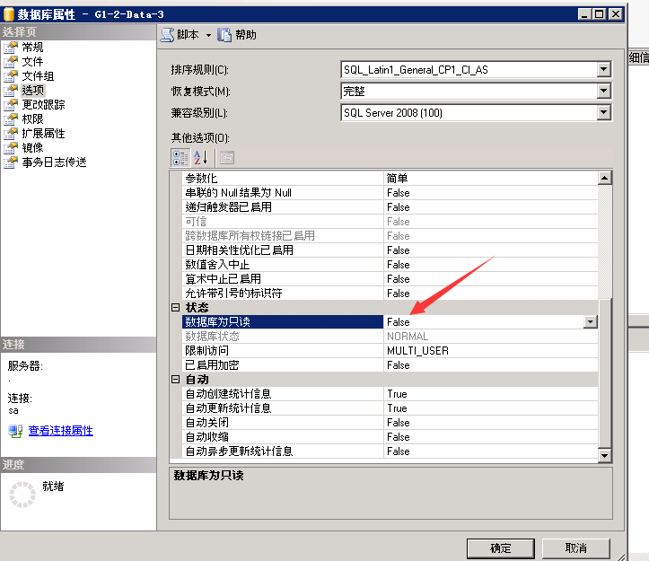 4、再去數(shù)據(jù)庫的屬性中,將“數(shù)據(jù)庫只讀選項” 同true 改為 false ,數(shù)據(jù)庫正常