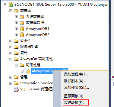 1)選擇可用性組,右單擊,選擇故障轉(zhuǎn)移