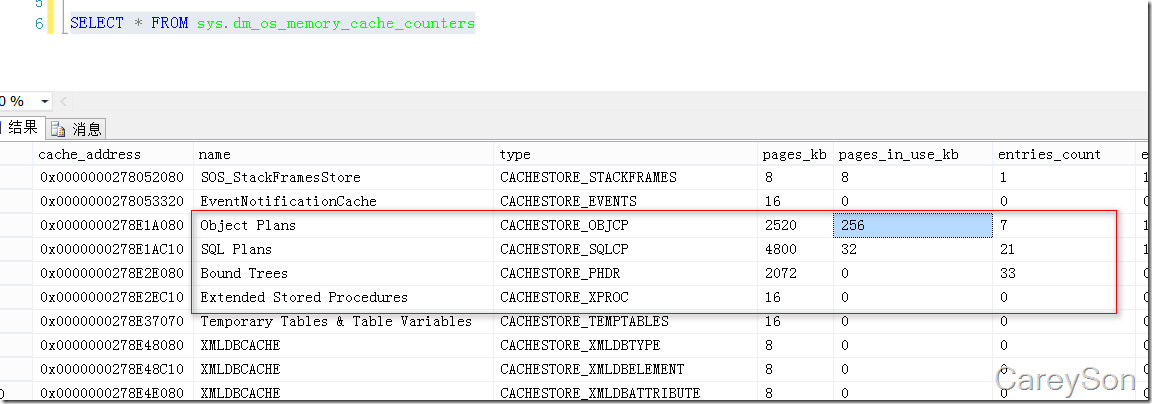 那究竟這幾類(lèi)對(duì)象緩存所占用的內(nèi)存相關(guān)信息該怎么看呢?我們可以通過(guò)dm_os_memory_cache_counters這個(gè)DMV看到,上述幾類(lèi)被緩存的對(duì)象如圖2所示。