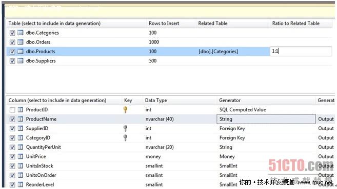 在上圖中,比如象Products表,還可以設(shè)置它的相關(guān)聯(lián)的表,如Categories表,還可以設(shè)置其關(guān)聯(lián)關(guān)系(在Ratio to Related列中設(shè)置),如1:1一對(duì)一關(guān)系。而在下方的列的部分,注意其中的每個(gè)列的Generator生成器中,甚至可以設(shè)置使用正則表達(dá)式去生成數(shù)據(jù),如下圖,十分方便。