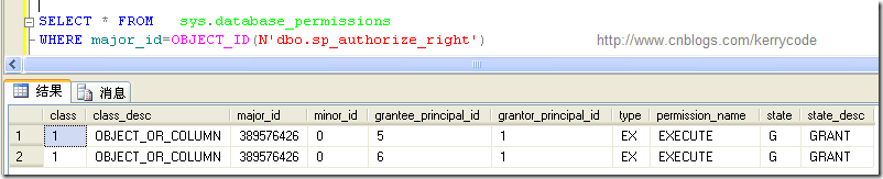 此時,已經(jīng)實現(xiàn)了擁有DML操作權(quán)限,如果需要擁有存儲過程和函數(shù)的執(zhí)行權(quán)限,必須使用GRANT語句去授權(quán),一個生產(chǎn)庫的存儲過程和函數(shù)加起來成千上百,如果手工執(zhí)行的話,那將是一個辛苦的體力活,而我手頭有十幾個庫,所以必須用腳本去實現(xiàn)授權(quán)過程。下面是我寫的一個存儲過程,亮點主要在于會判斷存儲過程、函數(shù)是否已經(jīng)授予了EXE或SELECT權(quán)限給某個用戶。這里主要用到了安全目錄試圖sys.database_permissions,例如,數(shù)據(jù)庫里面有個存儲過程dbo.sp_authorize_right,如果這個存儲過程授權(quán)給Test用戶了話,那么在目錄試圖sys.database_permissions里面會有一條記錄,如下所示: