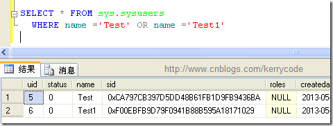 SELECT * FROM sys.sysusers WHERE name ='Test' OR name ='Test1'