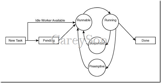 Worker實際上會對應Windows上的一個線程,并與某個特定Scheduler綁定,每一個Worker只要開始執(zhí)行Task,除非Task完成,否則Worker永遠不會放棄這個Task,如果一個Task在運行過程由于鎖、IO等陷入等待,那么實際上Worker就會陷入等待。