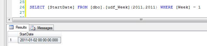 SELECT [StartDate] FROM [dbo].[udf_Week](2012,2012) WHERE [Week] = 1