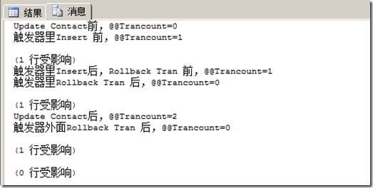 從上邊的測試情況,看出,Update Contact觸發(fā)tr_Contact觸發(fā)器操作,觸發(fā)器里面的Rollback Tran 動(dòng)作導(dǎo)致了觸發(fā)器外面的Update語句執(zhí)行回滾,而Rollback Tran 語句后面的Begin Tran語句,主要是應(yīng)用于保持整個(gè)事務(wù)的完整性。為了更能理解這一過程,我模擬了一個(gè)觸發(fā)器中的事務(wù)開始結(jié)束過程。