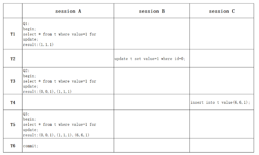 眾所周知,select ...for update語句就是將相應(yīng)的數(shù)據(jù)行鎖住,比如session A在T1時刻的Q1查詢語句:select * from where value=1 for update就是將value=1的數(shù)據(jù)行鎖住,但顯然如果是上述的場景發(fā)生,此時的for update語義被破壞了(并沒有鎖住value=1的數(shù)據(jù)行)。