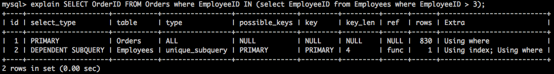 /* select#1 */ select `northwind`.`orders`.`OrderID` AS `OrderID` from `northwind`.`employees` join `northwind`.`orders` where ((`northwind`.`orders`.`EmployeeID` = `northwind`.`employees`.`EmployeeID`) and (`northwind`.`employees`.`EmployeeID` > 3))