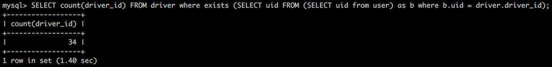 SELECT count(driver_id) FROM driver where exists (SELECT uid FROM (SELECT uid from user) as b where b.uid = driver.driver_id);