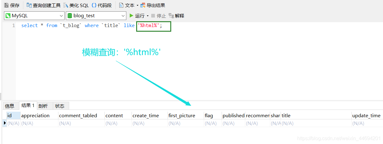 查詢結(jié)果 select * from t_blog where title like ‘%html%';