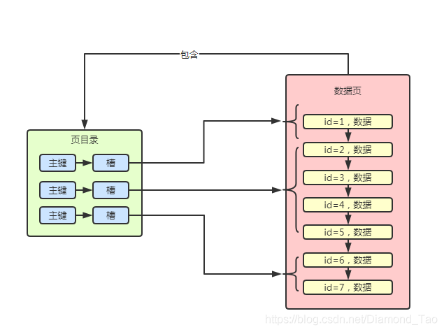 每個數(shù)據(jù)頁都有自己的頁目錄上面頁結(jié)構(gòu)中的Page Directory,這個頁目錄的作用實(shí)際上就是用來進(jìn)行數(shù)據(jù)行定位的。數(shù)據(jù)頁中的數(shù)據(jù)實(shí)際上是按組分配的,頁目錄中的不同的槽位,其實(shí)是對應(yīng)了數(shù)據(jù)頁中的不同的分組,查詢數(shù)據(jù)時,通過id找到對應(yīng)的槽,再根據(jù)對應(yīng)的槽來知道對應(yīng)在數(shù)據(jù)頁中的數(shù)據(jù)行分組,遍歷數(shù)據(jù)行分組中的數(shù)據(jù)直到找到對應(yīng)的數(shù)據(jù)。