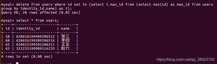 假設(shè)一個(gè)場(chǎng)景,一張用戶表,包含3個(gè)字段。id,identity_id,name?,F(xiàn)在身份證號(hào)identity_id和姓名name有很多重復(fù)的數(shù)據(jù),需要?jiǎng)h除只保留一條有效數(shù)據(jù)。