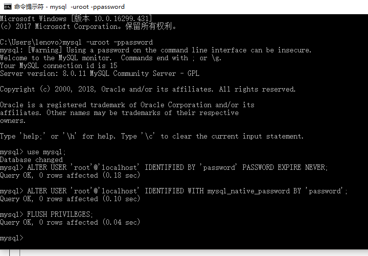 ALTER USER 'root'@'localhost' IDENTIFIED BY 'password' PASSWORD EXPIRE NEVER; #更改加密方式