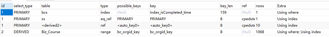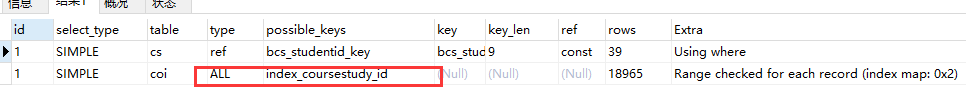 通過(guò)看索引,原因是因?yàn)閟id為bigint , CourseStudyID 的類(lèi)型確實(shí)varchar,原因就是在這里,修改類(lèi)型為bigint后,查詢(xún)速度瞬間提升.
