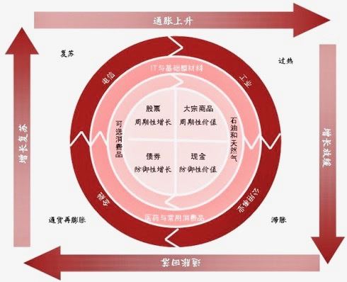 宏觀經(jīng)濟(jì)、金融市場、公司所屬行業(yè)等也有相應(yīng)的運(yùn)行周期,相應(yīng)的周期分析工具也非常豐富。在這里,推薦使用美林時鐘進(jìn)行分析,簡單明了,對于搭建整體的認(rèn)知框架很有幫助。