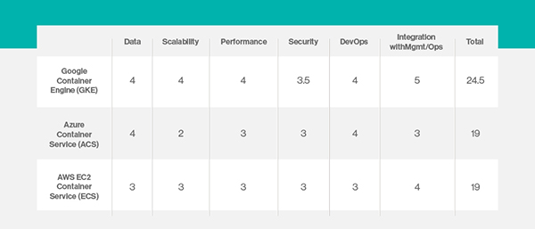 1-5的分值,1是最低分,5是最高分。打分為1意味著該技術(shù)完全沒有提供對該項的支持,而5意味著該技術(shù)滿足了該項的絕大部分特性和功能需求。在DevOps項考察的需求,是容器子系統(tǒng)支持DevOps運維,或者提供集成倉庫的能力。 對于正在評估Google、AWS或者Azure容器服務(wù)的企業(yè)來說,本文提供了一些基本知識。但是你自己應(yīng)用程序的具體需求才是驅(qū)動最終產(chǎn)品決策最重要的因素。
