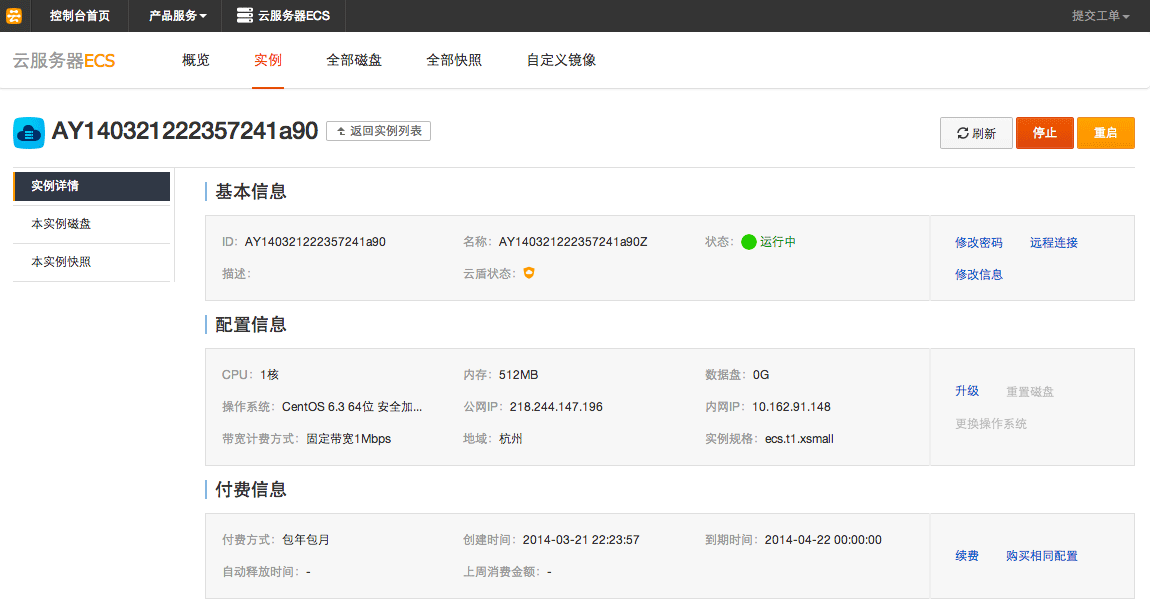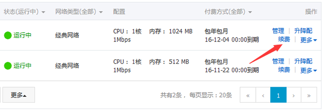 這里我們可以看到上面升級(jí)的1GB內(nèi)存方案已經(jīng)生效,如果需要續(xù)費(fèi)看到上圖點(diǎn)擊"續(xù)費(fèi)"鏈接。