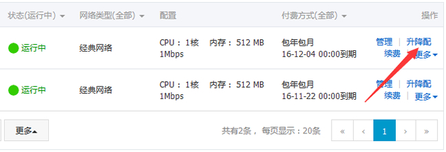 這里我們進(jìn)入當(dāng)前已經(jīng)運(yùn)行中的服務(wù)器,可以看到上圖所示。點(diǎn)擊對(duì)應(yīng)機(jī)器的"升降配"鏈接,可以給當(dāng)前服務(wù)器升級(jí)和降低操作。