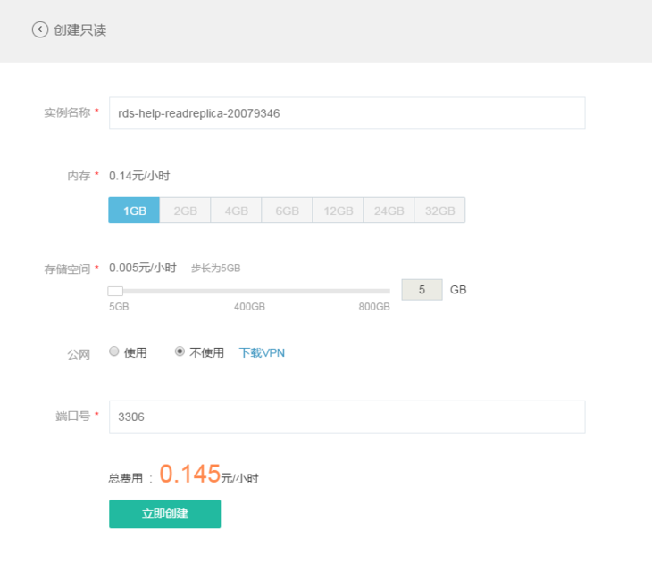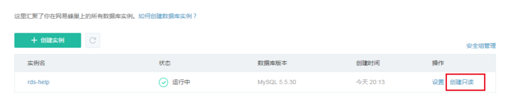 數(shù)據(jù)庫主界面顯示了各個實例的概要信息。如果實例是一個高可用實例,則在實例的「操作」列會顯示「創(chuàng)建只讀」鏈接。點擊「創(chuàng)建只讀」,即可為實例創(chuàng)建一個只讀實例,如下圖所示: