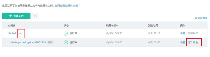 在數(shù)據(jù)庫的主界面,點擊實例名稱右側(cè)的箭頭(如果存在),可以查看該實例的只讀實例。對于只讀實例,「操作」列提供了「提升角色」的功能,如下圖所示。點擊「提升角色」并確認(rèn),能夠解除只讀實例與源實例的關(guān)系,將只讀實例變成一個普通的非高可用實例。