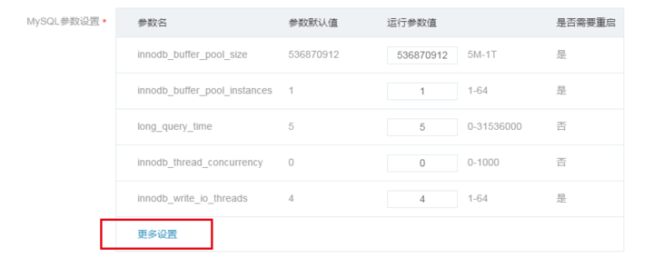 在參數(shù)組設(shè)置中,你可以修改數(shù)據(jù)庫的配置。頁面中只顯示用戶最常修改的參數(shù),要查看和修改更多的參數(shù),點擊「更多設(shè)置」即可。