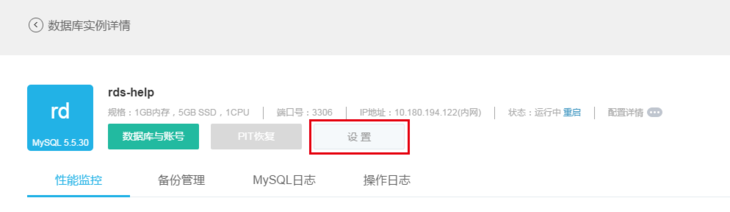 2.在數(shù)據(jù)庫的主界面,點擊該實例的名稱,進入該實例的「實例詳情」頁面,再點擊「設(shè)置」按鈕,如下圖所示: