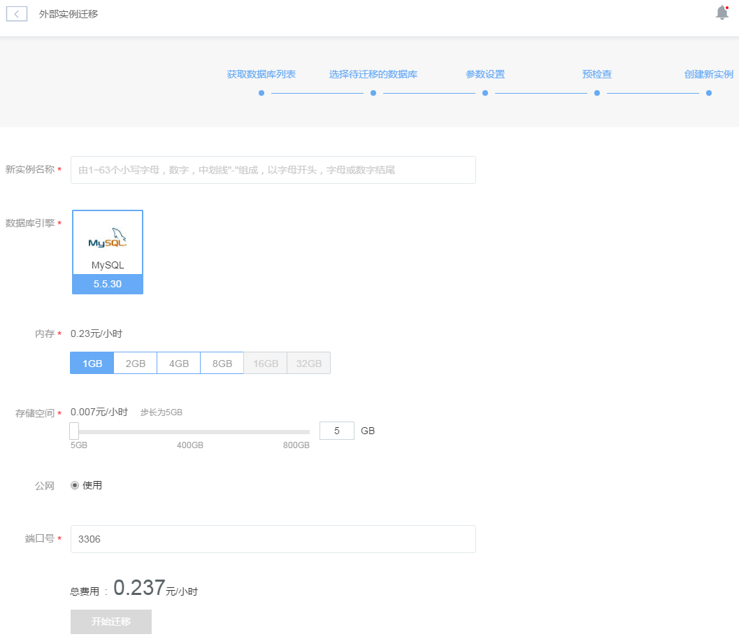 系統(tǒng)預(yù)檢查無誤后,顯示如下「創(chuàng)建新實例」頁面,即可進行數(shù)據(jù)遷移,此時只需填寫新實例名稱,選擇合適的內(nèi)存及存儲空間后,點擊「開始遷移」即可,數(shù)據(jù)庫列表會自動生成遷移的數(shù)據(jù)庫實例。