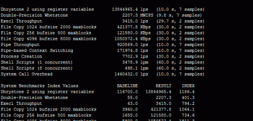6、用Unixbench 5.1.2測試VPS主機(jī)性能,512MB的OpenVZ測試得分在800分。