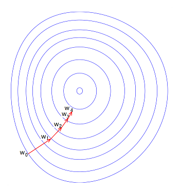 即w沿著損失函數(shù)的負(fù)梯度方向進(jìn)行調(diào)整,示意圖見下圖,的梯度即一階導(dǎo)數(shù)(見下式),梯度下降有多種類型,如隨機(jī)梯度下降或批量梯度下降。